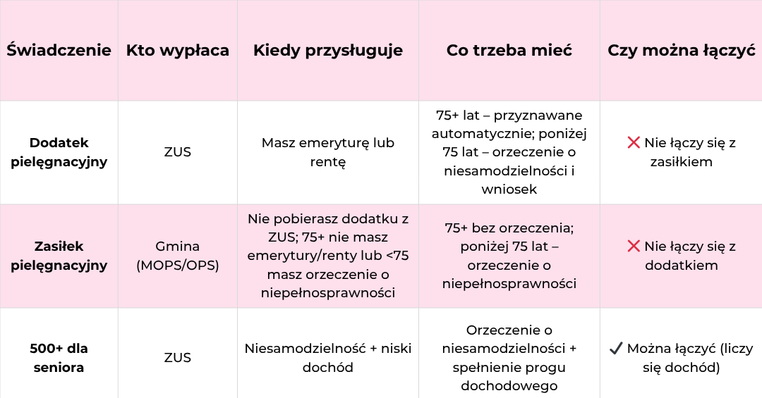 Ważna jest też różnica w orzeczeniach. Dodatek pielęgnacyjny i 500+ dla seniora opierają się na orzeczeniu o niesamodzielności. Zasiłek pielęgnacyjny wymaga natomiast orzeczenia o niepełnosprawności.