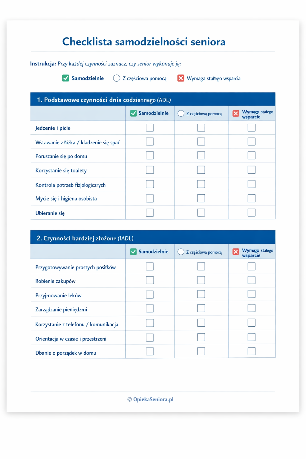 Domowa obserwacja ma charakter wstępny i nie zastąpi specjalistycznej oceny lekarskiej. Jej celem jest spokojne, praktyczne zebranie faktów dotyczących codziennych czynności wykonywanych przez seniora w naturalnym rytmie dnia. Aby ułatwić obserwację, warto przygotować prostą checklistę. Najlepiej prowadzić obserwacje przez kilka dni, zaznaczając przy każdej czynności, czy jest wykonywana samodzielnie, z częściową pomocą, czy wymaga stałego wsparcia. Przygotowaliśmy dla Ciebie gotową checklistę do pobrania za darmo.
