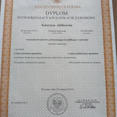 Jestem opiekunem z dyplomem opiekuna medycznego w maju lub czerwcu rozpoczynam kurs doszkalający MED 14 po którym moje kwalifikacje wzrosną jeszcze bardziej.